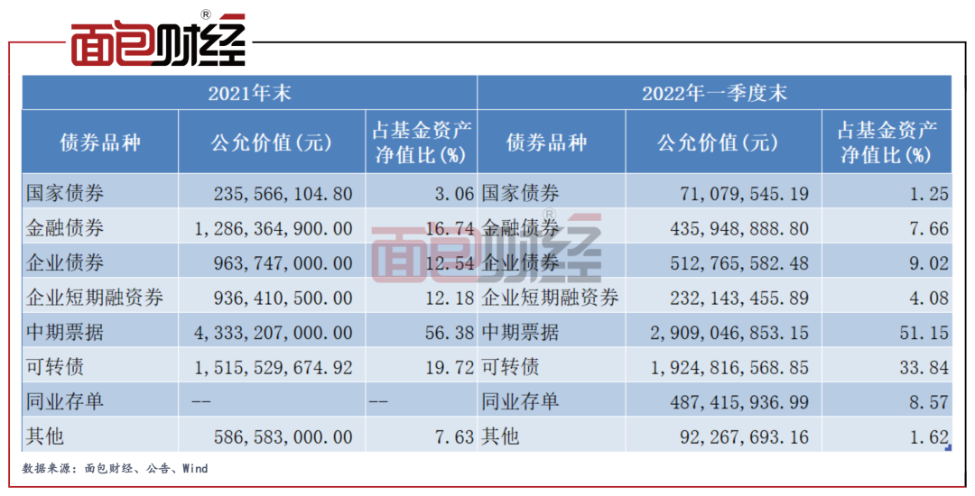 但從具體配置來看,一季度持倉向可轉(zhuǎn)債集中,風(fēng)格較為激進(jìn)。2022年一季度末,可轉(zhuǎn)債(可交換債)的公允價(jià)值約19.25億元,相對(duì)上期增加了約14%,占資產(chǎn)凈值的33.84%。而同期,基金倉位中的中期票據(jù)、企業(yè)債、金融債的比例均有下降。