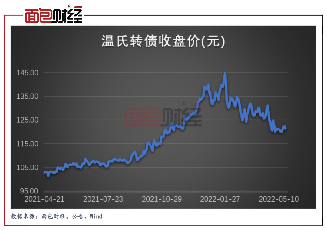 在轉(zhuǎn)債市場(chǎng)疲軟和公司業(yè)績大跌的雙重影響下,溫氏轉(zhuǎn)債價(jià)格大幅下跌,2022年5月18日收盤價(jià)為122.5元,較2月最高價(jià)146.35元跌幅超過16%,年初至今回撤超過9%。