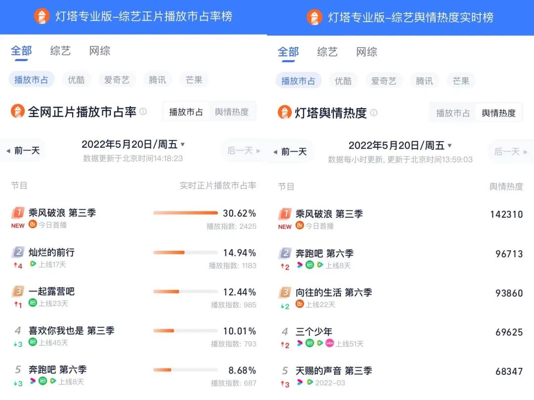 除此之外,中午節(jié)目播出后,僅是上線2小時,實時燈塔正片播放市占已迅速上升至30.62%位列第一,正片播放、熱度雙領(lǐng)跑全網(wǎng)綜藝節(jié)目;與此同時,節(jié)目也迅速席卷了貓眼綜藝熱度榜等。