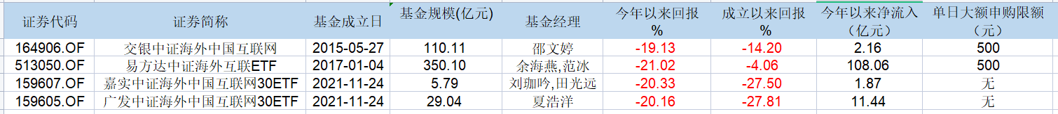 Wind數(shù)據(jù)顯示,截至5月23日,上述四只ETF今年以來收益率均在-20%左右,但規(guī)模卻不降反增。易方達(dá)中證海外互聯(lián)ETF今年以來資金凈流入達(dá)108.06億元,廣發(fā)中證海外中國互聯(lián)網(wǎng)30ETF凈流入資金為11.44億元。