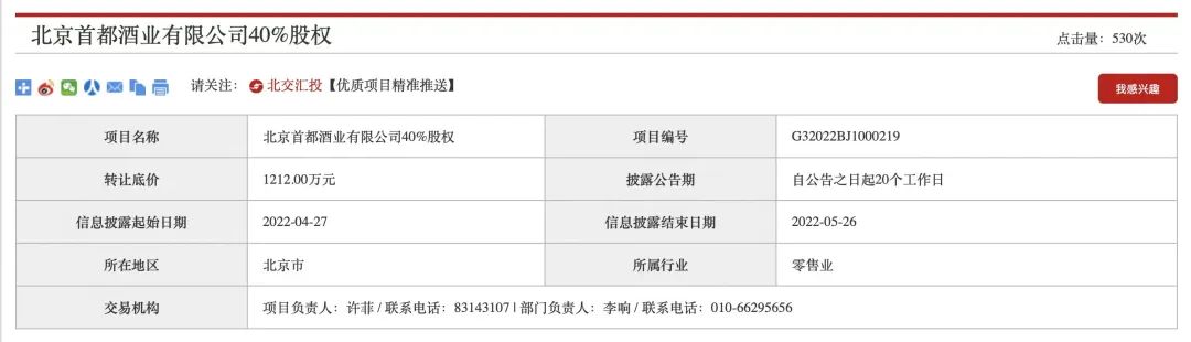 5月23日,距離北京首都酒業(yè)有限公司(下稱“首都酒業(yè)”)擬轉(zhuǎn)讓40%股權(quán)信批披露還有三天時間。5天前,首都酒業(yè)40%股權(quán)亮相北京產(chǎn)權(quán)交易所,轉(zhuǎn)讓方為北京北控京泰投資管理有限公司(以下簡稱“北控京泰”),轉(zhuǎn)讓底價為1212萬元。據(jù)酒訊了解,轉(zhuǎn)讓方北控京泰旗下還擁有北京紅星股份有限公司45%股份。此次“清倉式轉(zhuǎn)讓”讓沉溺許久的“京酒”第二股紅星上市路再次進入公眾視野。