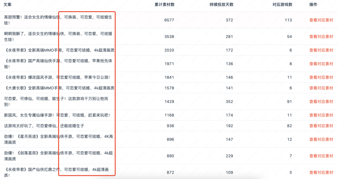 針對(duì)這一點(diǎn),DataEye研究院也從眾多素材文案中發(fā)現(xiàn),“可戀愛(ài)”、“可結(jié)婚”等詞匯,也是廠商在營(yíng)銷(xiāo)市場(chǎng)的布局重心。