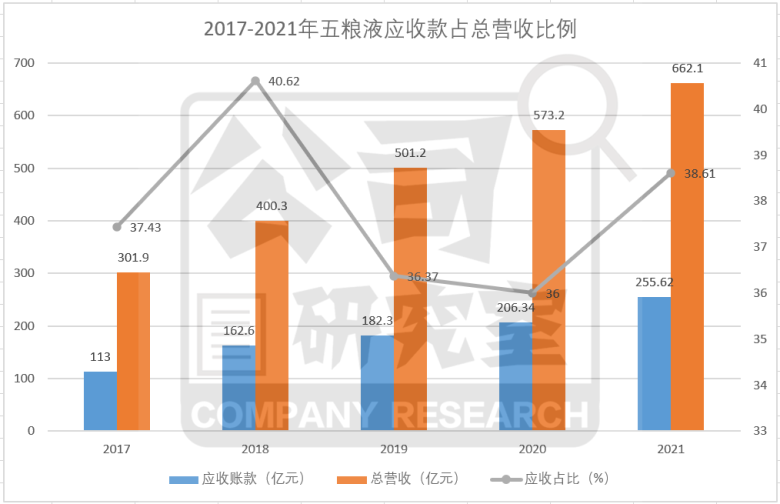 人們印象中,頭部白酒公司現(xiàn)金流很好,營(yíng)收多是真金白銀,甚至不打款不發(fā)貨,但五糧液的財(cái)務(wù)現(xiàn)狀顯然不是這樣。從營(yíng)收占比看,2017-2021年間,五糧液應(yīng)收款項(xiàng)占總營(yíng)收比例分別為37.43%、 40.62 %、 36.37%、 36.00 %、 38.61%。也就是說(shuō),5年間,五糧液營(yíng)收中超過(guò)1/3是應(yīng)收款項(xiàng)。