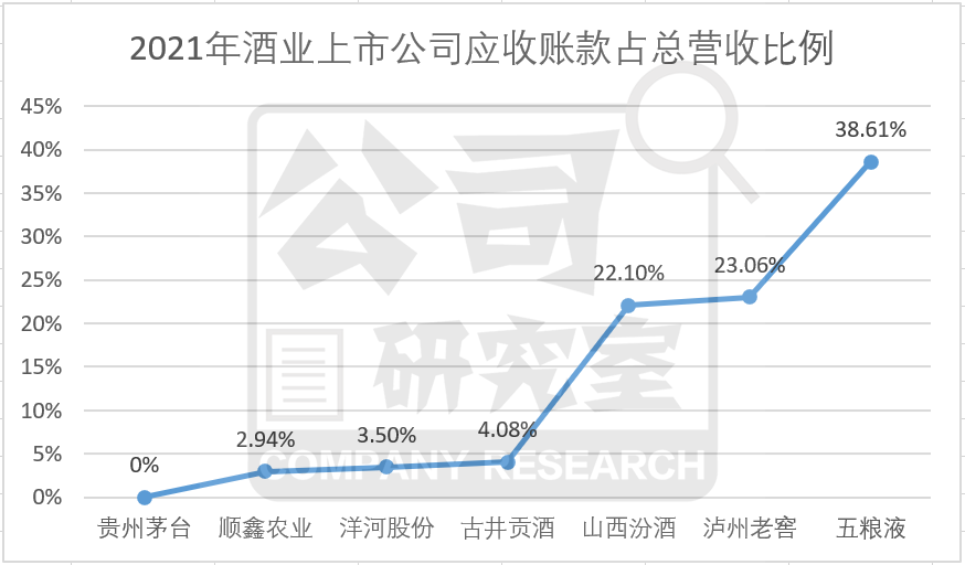 在百億規(guī)模的白酒公司中,以2021年年報(bào)為例,應(yīng)收賬款占總營(yíng)收比例這個(gè)數(shù)據(jù):貴州茅臺(tái)為0%,沒(méi)有應(yīng)收款;順鑫農(nóng)業(yè)(000860.SZ)2.94%,洋河3.50%、古井貢酒(000596.SZ)4.08%、山西汾酒22.10%、瀘州老窖為23.06%。與上述6家相比,五糧液38.61%占比,確實(shí)偏高。