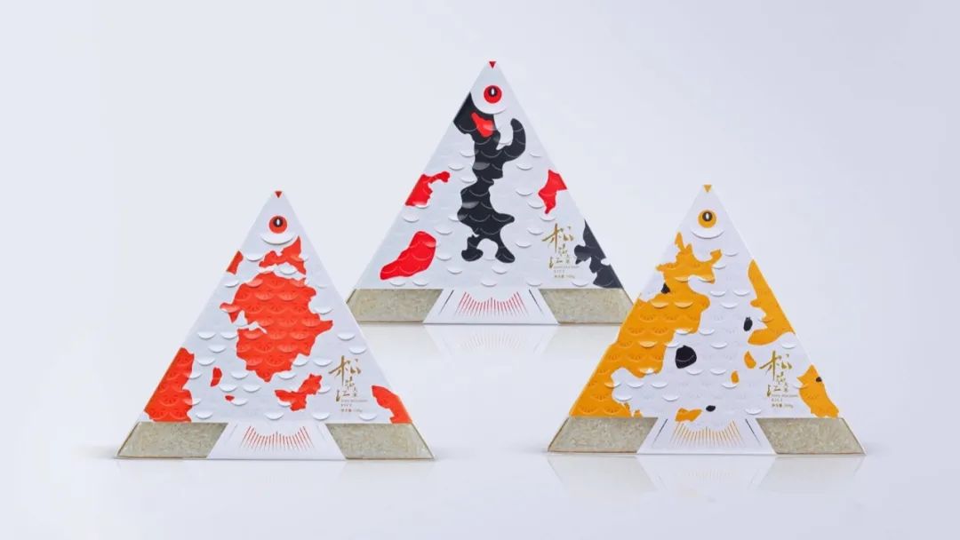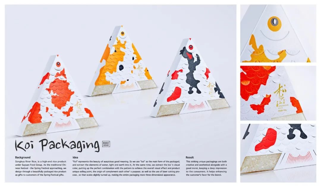 33 And Branding為松花江大米設(shè)計的包裝,此次融入了中國傳統(tǒng)文化元素。以“錦鯉”為產(chǎn)品的主要造型,提取錦鯉的主要視覺色彩,同時將水、光、土等元素提取到其中。此外,三角形的精巧造型延續(xù)了以魚為靈感的設(shè)計,采用獨特的細紋珠光紙,突出光滑度和質(zhì)感,采用激光切割技術(shù)結(jié)合人工,讓魚鱗微微翹起,使整個包裝更具立體感。