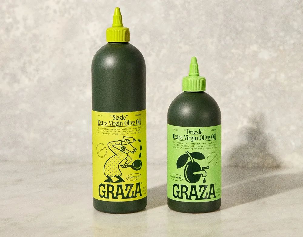 Graza的油是未混合的,由100%西班牙哈恩種植的皮庫爾橄欖制成“我們的品牌‘為使用而生’,我們相信您可以在何時何地使用橄欖油?!癎raza首席執(zhí)行官表示。包裝由創(chuàng)意機構(gòu)Gander開發(fā),品牌標識和包裝清楚地說明了可接近性和可用性,從受專業(yè)廚房啟發(fā)的可回收擠壓瓶開始。瓶身文案基調(diào)隨意,文字標記采用西班牙風格排版,瓶子上有俏皮的插圖。