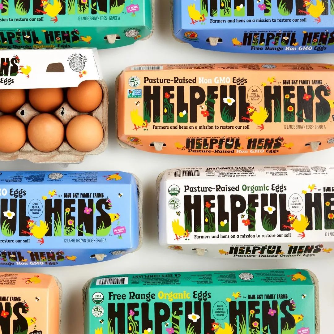 再生農(nóng)業(yè)是一種已經(jīng)存在多年的實踐,它正在重新回到我們雜貨店的產(chǎn)品中。再生農(nóng)業(yè)通過使用漸進和整體的輪作、堆肥和有計劃的放牧實踐以及其他方法和工具來幫助開發(fā)土地。母雞雞蛋實現(xiàn)了再生農(nóng)業(yè),此次設(shè)計通過紙箱正面俏皮活潑的插圖和充滿個性的字體講述故事。此外,在不同的彩色包裝中,雞蛋類型也不同。