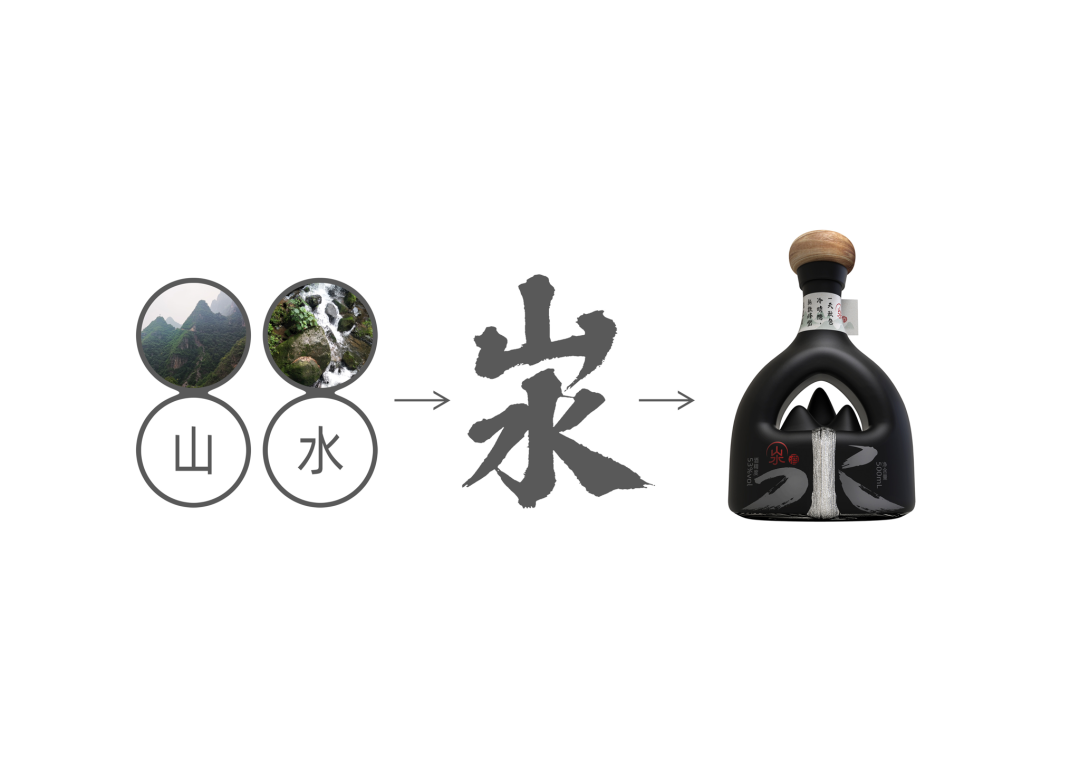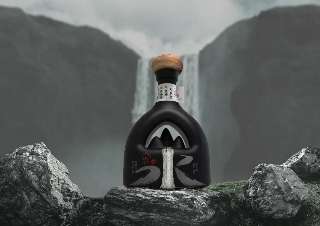 汖,發(fā)音為“Pin”,是一個簡單而罕見的漢字,上面有山,下面有水?!皻币鉃椤捌俨肌保仓浮昂蒙胶盟玫胤健?,是制作出優(yōu)秀陳年白酒的關(guān)鍵。這種設(shè)計以直觀但富有表現(xiàn)力的方式將漢字轉(zhuǎn)化為高端白酒瓶。主要視覺風格采用了中國傳統(tǒng)藝術(shù)的水墨畫,加上有意留白的空間,帶來無盡的想象。