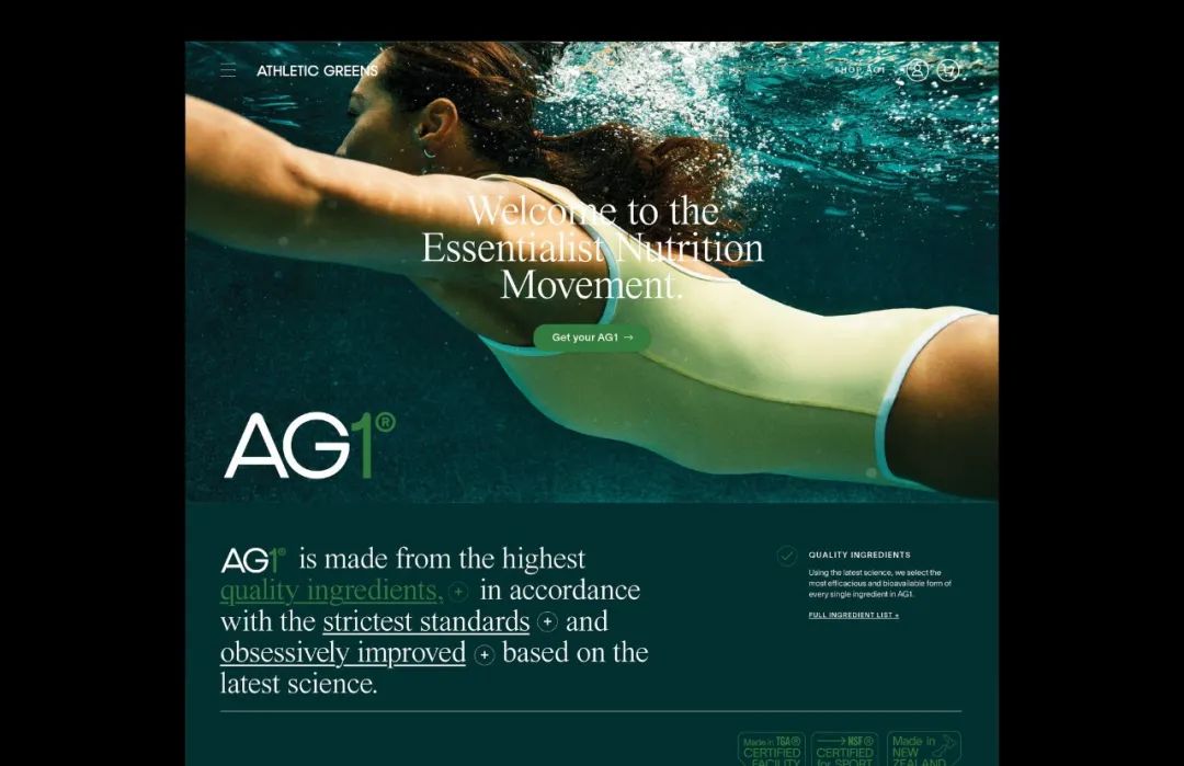 Athletic Greens根植于公司極簡的產(chǎn)品理念,打造了名為Essential Nutrition的品牌創(chuàng)意平臺。之前的主導(dǎo)品牌顏色是藍色,但此次考慮品牌名中帶有“綠色”,選擇了一種現(xiàn)代的綠色,給人一種深情、健康和干凈的感覺。排版具有現(xiàn)代運動外觀,但布局靈感來自舊廣告,使用Times Now作為頭條新聞,郵票和徽章給人一種值得信賴的感覺。