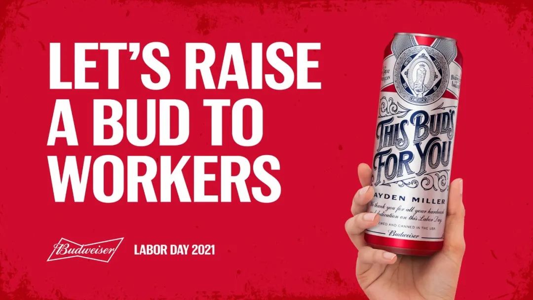 百威希望為2021年勞動節(jié)#RaiseABud活動打造限量罐,號召百威粉絲通過社交媒體提名工人,有10名幸運的決賽入圍者收到了印有他們的名字的個性化勞動節(jié)百威啤酒罐。設(shè)計師使用“血”、“汗水”和“啤酒”作為靈感點,并對標志性的百威啤酒設(shè)計進行了細微改動,包括重新設(shè)計徽章,使其類似于獎?wù)潞投ㄖ频钠【票鍒D,設(shè)計以獲勝者的名字為中心,上面寫著“This Bud's For You”。