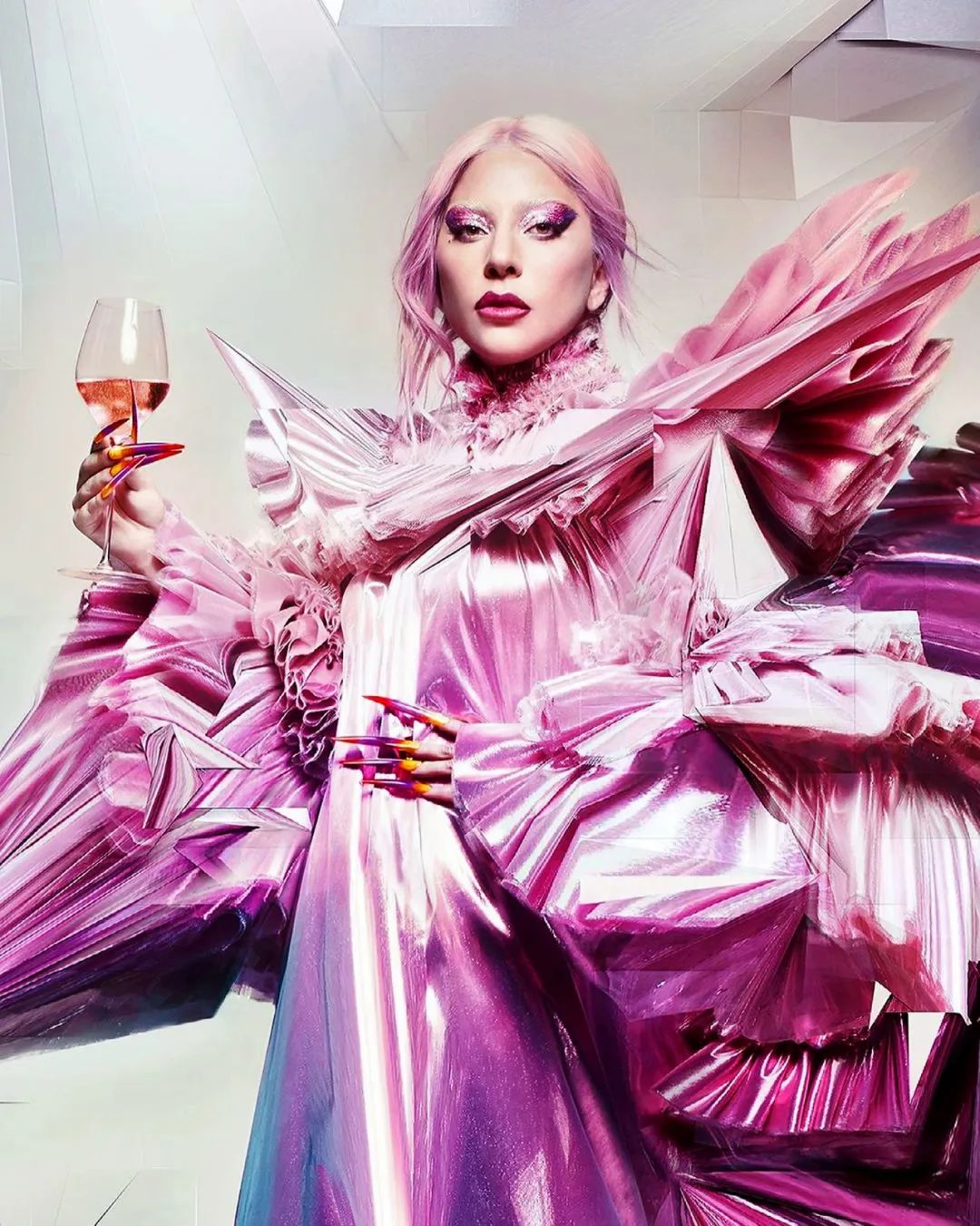 Lady Gaga與香檳品牌Dom Pérignon合作,為我們帶來了一個意想不到的混搭。設(shè)計以Lady Gaga為特色,戴著王冠和帶翅膀的斗篷,手里拿著粉紅色Dom瓶,具有鮮明的女王氣質(zhì)。