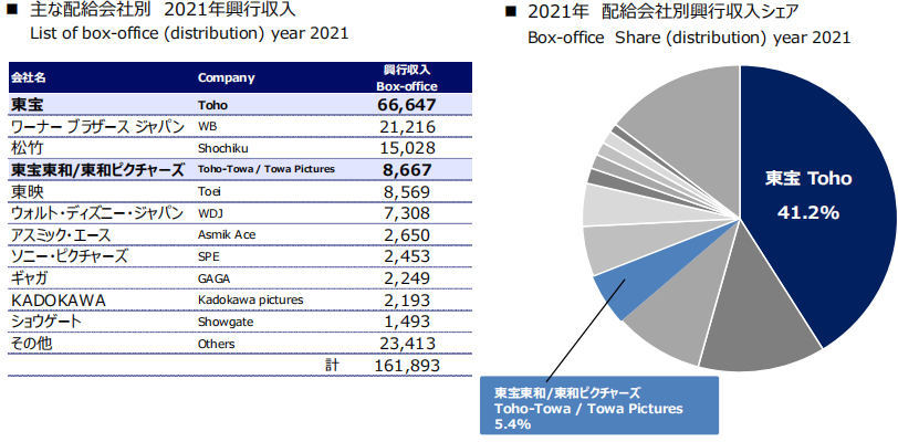 2021年,東寶電影發(fā)行收入穩(wěn)居日本第一,加上東寶東和與東和Pictures,東寶共有46.6%的市場份額。
