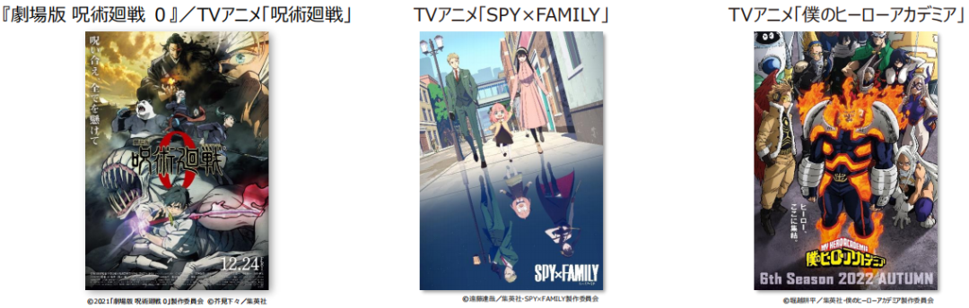動(dòng)畫制作方面,對(duì)TV動(dòng)畫《咒術(shù)回戰(zhàn)》、《我的英雄學(xué)院》、《哥斯拉S.P》、《排球少年》等作品以及電影《我的英雄學(xué)院:世界英雄任務(wù)》、《劇場版 咒術(shù)回戰(zhàn)0》的制作投資回報(bào)相較去年增收。