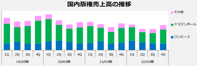 國內(nèi)版權(quán)部門方面,《海賊王》等作品的商品化權(quán)利收入良好,但《龍珠》的游戲化版權(quán)收入不如去年,整體減收。