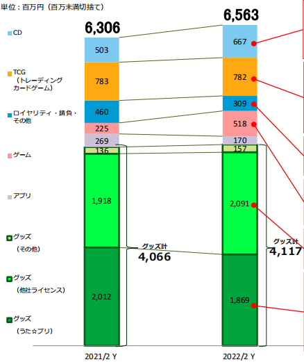 下圖為Broccoli各項(xiàng)業(yè)務(wù)銷售額及與去年的對(duì)比。從上到下依次是CD、TCG、專利等其他業(yè)務(wù)、游戲、APP、其他周邊、其他公司授權(quán)周邊、歌之王子殿下周邊。