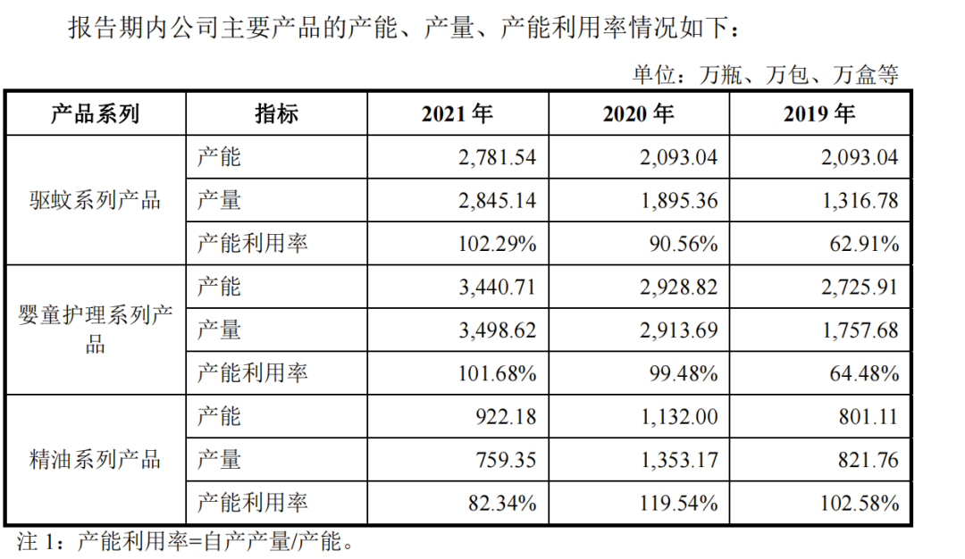 同時(shí),潤(rùn)本在嬰童護(hù)理系列產(chǎn)品的產(chǎn)能、產(chǎn)量及產(chǎn)能利用率也逐年上漲。2019—2021年,其產(chǎn)能利用率分別達(dá)64.48%、99.48%、101.68%。除了在2021年略低于驅(qū)蚊系列產(chǎn)品102.29%的產(chǎn)能利用率,嬰童護(hù)理系列產(chǎn)品在產(chǎn)能及產(chǎn)能利用率上均居潤(rùn)本三大核心業(yè)務(wù)之首。