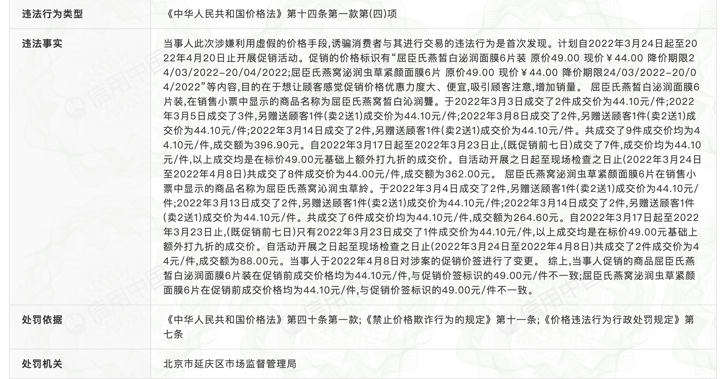 據(jù)行政處罰書顯示,該店自2022年3月24日起至2022年4月20日止開展促銷活動。其中,屈臣氏燕皙白泌潤面膜(6片裝)原價49元,促銷價44元,屈臣氏燕窩泌潤蟲草緊顏面膜(6片裝)也是原價49元,促銷價44元。