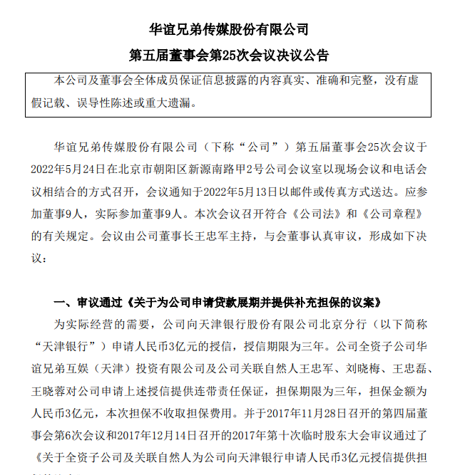 華誼兄弟表示,截至今年5月24日,公司已向天津銀行償還了0.34億元的借款本金,借款余額為2.16億元。