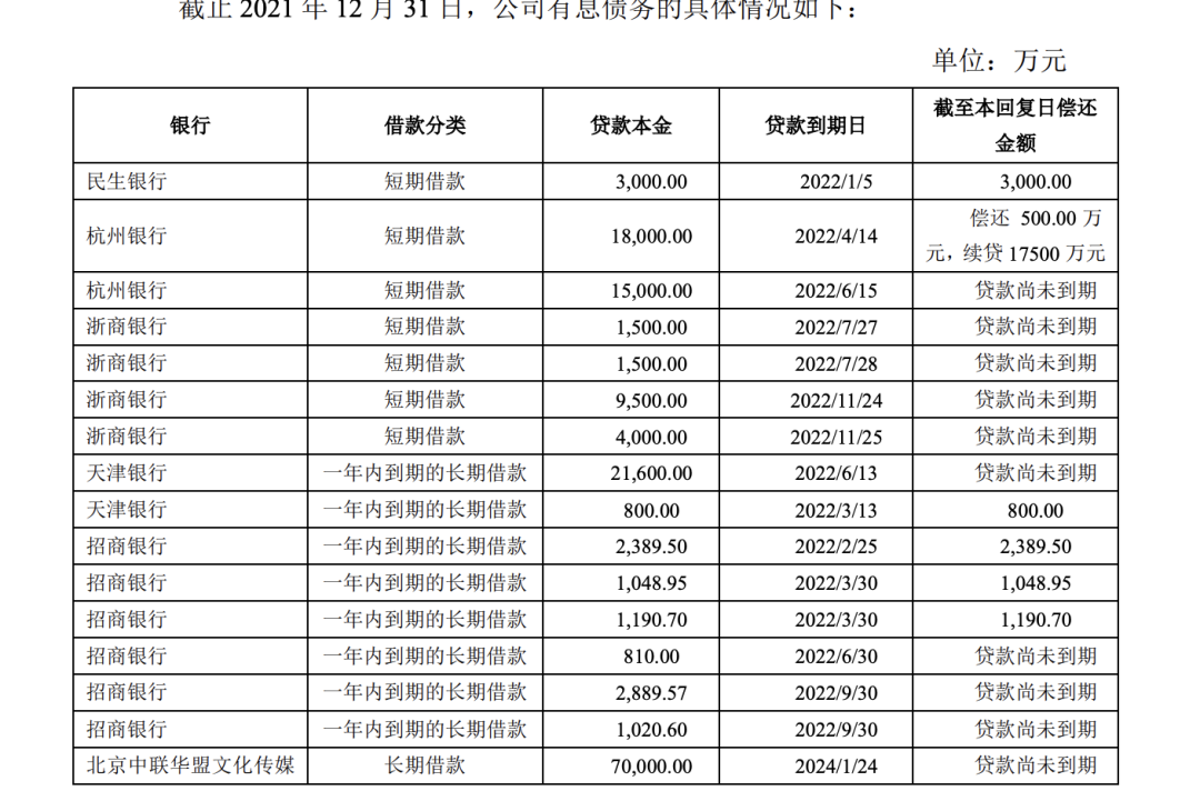 對此,華誼兄弟回復稱,截至2022年5月20日,公司通過經營活動及資產處置產生的現(xiàn)金回流償還有息負債累計8929.15萬元,累計完成1.75億元借款的續(xù)貸合約簽署。借款的續(xù)貸工作正在積極溝通協(xié)商中,公司不存在無法償還即將到期且難以續(xù)貸的借款。