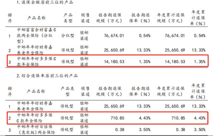 值得注意的是,中郵年年好多多保 C款年金保險在退保規(guī)模和退保率方面前后所載信息不一致,差別較大。