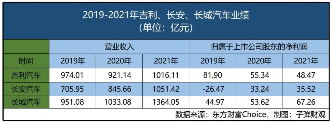 同期,長(zhǎng)城汽車(chē)業(yè)績(jī)則表現(xiàn)出穩(wěn)定的增長(zhǎng)趨勢(shì)。2019-2021年,長(zhǎng)城汽車(chē)營(yíng)收分別為951.08億元、1033.08億元和1364.05億元,歸屬于上市公司股東的凈利潤(rùn)分別為44.97億元、53.62億元和67.26億元。