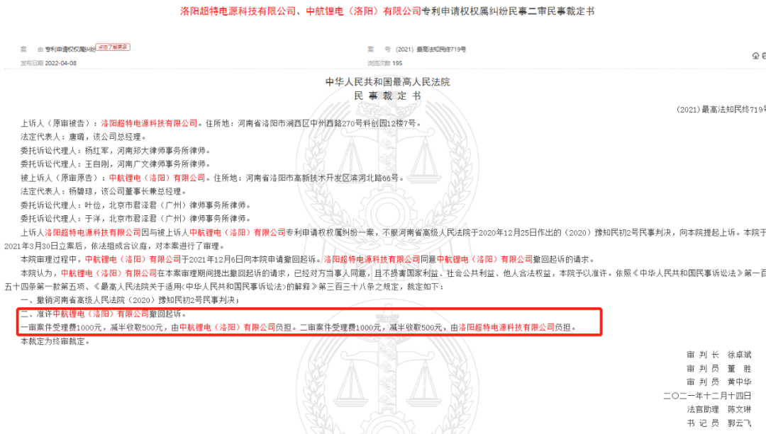 不過,蹊蹺的是,在2021年12月14日二審時,卻以中航鋰電(洛陽)主動撤回起訴告終。