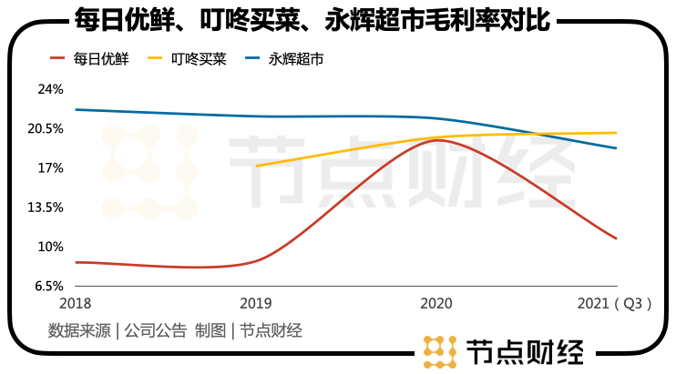 例如永輝超市在社區(qū)團(tuán)購(gòu)上的老對(duì)手叮咚買菜,2021年四季度的毛利率為27.7%,較三季度大幅提升近10個(gè)百分點(diǎn),說明社區(qū)團(tuán)購(gòu)已經(jīng)放棄了虧本燒錢,生鮮零售的行業(yè)競(jìng)爭(zhēng)也趨于緩和,盈利或許是業(yè)內(nèi)公司目前的共識(shí)。
