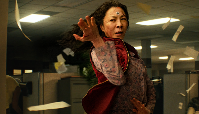 電影《瞬息全宇宙》(又名《媽的多重宇宙》)圍繞55歲美國(guó)亞裔婦女“伊芙琳”(楊紫瓊 飾)的家庭生活展開,又聚焦于她平常生活中脫軌的一天:這一天,她要維持洗衣店十年如一日的正常運(yùn)轉(zhuǎn)、為遠(yuǎn)赴重洋而來(lái)的老父親慶生、阻止叛逆女兒?jiǎn)桃粒ㄔS緯倫 飾)的出柜、應(yīng)對(duì)與丈夫威蒙(關(guān)繼威 飾)的情感危機(jī),以及得去稅務(wù)局向刁鉆的女公務(wù)員解釋混亂的稅務(wù)問(wèn)題。導(dǎo)演關(guān)家永和丹尼爾·施納特還給這個(gè)中年婦女慘淡經(jīng)營(yíng)的生活故事裹上了一層“超級(jí)英雄敘事”的浮華外衣:伊芙琳習(xí)得了在多重宇宙的自我間來(lái)回穿梭的能力,她需要在一系列的戰(zhàn)斗和探索中阻止世界的毀滅、拯救自己的女兒。