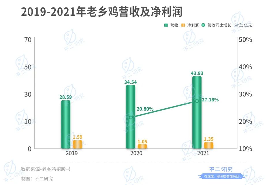 招股書顯示,2019-2021年,老鄉(xiāng)雞的營收為28.59億、34.54億和43.93億元,正值高速增長;凈利潤分別為1.59億、1.05億和1.35億元,尚未恢復(fù)疫前水平。