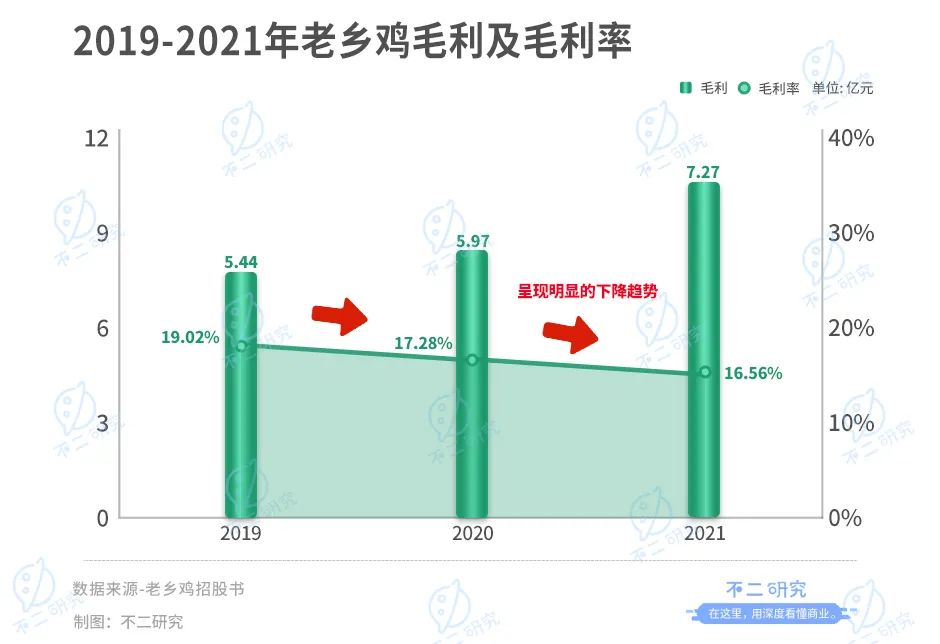 同時,毛利率也顯示出老鄉(xiāng)雞的短板。根據(jù)招股書,2019-2021年,老鄉(xiāng)雞整體毛利率分別為19.02%、17.28%、16.56%,呈現(xiàn)明顯的下降趨勢。對此,老鄉(xiāng)雞在招股書在解釋稱是受原材料成本上升、人工成本上升等因素影響。