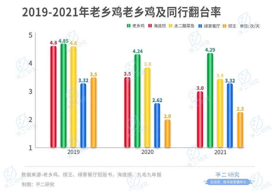 疫情之下、行業(yè)震蕩,餐飲企業(yè)的核心指標(biāo)——翻臺率遭嚴(yán)峻考驗(yàn)。根據(jù)招股書數(shù)據(jù),2019-2021年老鄉(xiāng)雞翻臺率分別為4.85次/天、4.24次/天和4.29次/天,整體處于下滑趨勢。不過作為快餐品牌,老鄉(xiāng)雞的翻臺率在行業(yè)內(nèi)仍然較高。根據(jù)年報(bào)及招股書,2019年~2021年,海底撈翻臺率分別為4.8次/天、3.5次/天和3.0次/天;太二酸菜魚翻臺率4.8次/天、3.8次/天和3.4次/天;綠茶餐廳翻臺率為3.32次/天、2.62次/天和3.32次/天;撈王翻臺率為3.5次/天、2.0次/天和2.3次/天。
