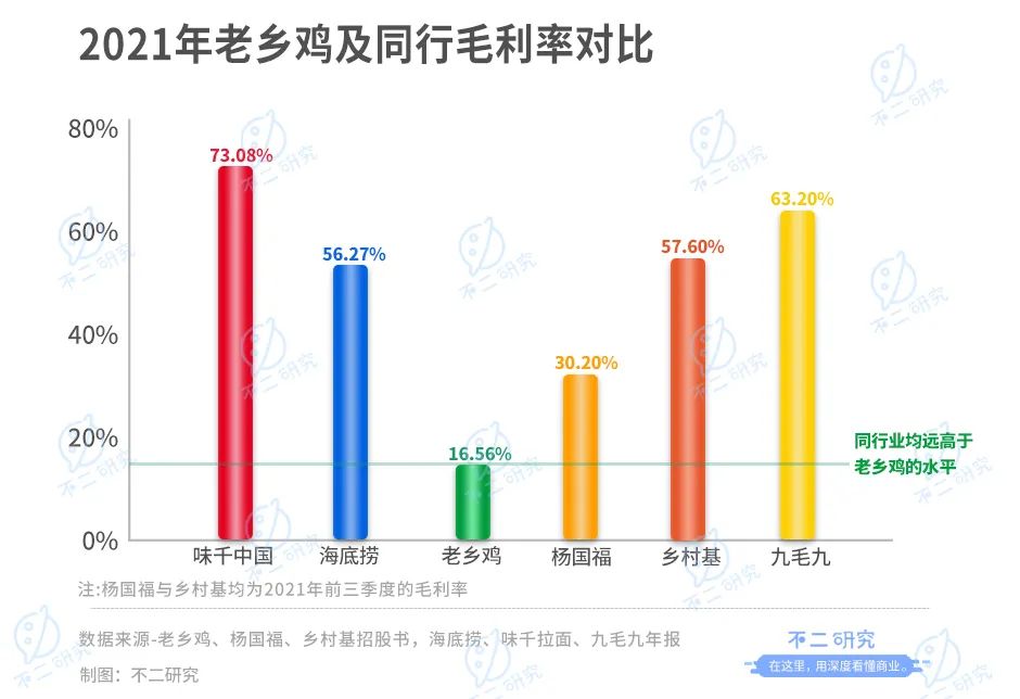 但即使在同行間,老鄉(xiāng)雞的毛利率水平也毫無優(yōu)勢。據(jù)2021年財(cái)報(bào),海底撈(06862.HK)、味千中國(00538.HK)、九毛九(09922.HK)的毛利率分別為56.27%、73.08%和63.2%;2021年前三季度,同樣沖刺上市的楊國福和鄉(xiāng)村基毛利率分別為30.2%和57.6%,均遠(yuǎn)高于老鄉(xiāng)雞的水平。