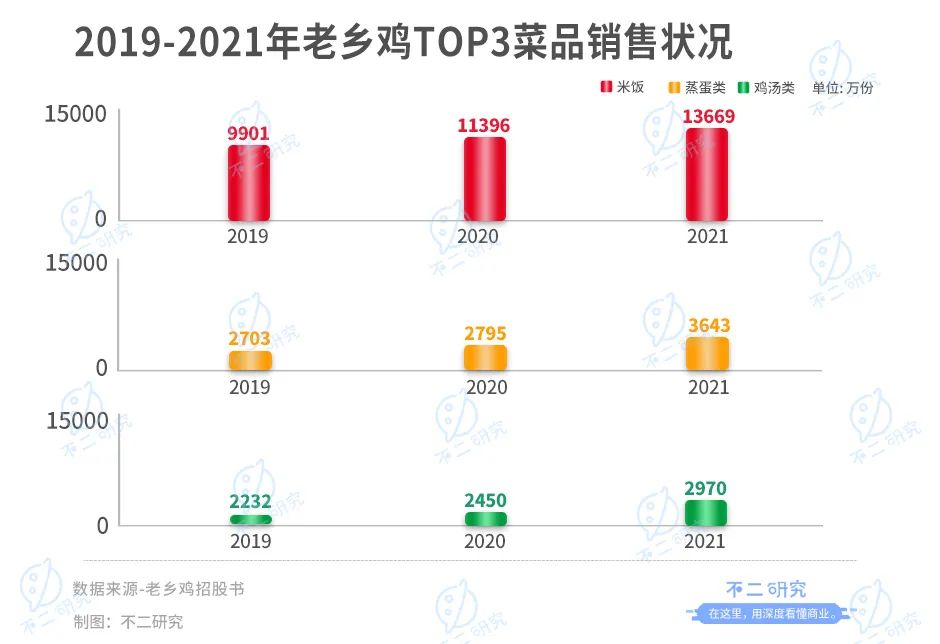 從產(chǎn)品構(gòu)成來看,老鄉(xiāng)雞以肥西老母雞湯產(chǎn)品為特色,但其最為暢銷的產(chǎn)品竟是米飯。2021年,老鄉(xiāng)雞銷售量Top3的菜品分別是米飯、蒸蛋和雞湯,分別售出1.37億、0.36億和0.30億份?!?/p>