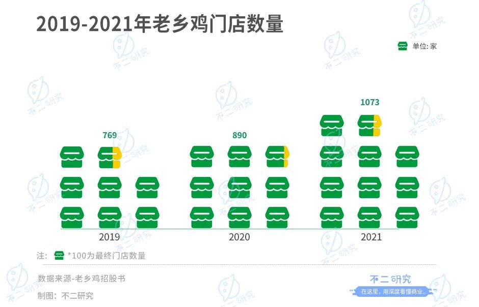根據(jù)招股書數(shù)據(jù),2019-2021年底,老鄉(xiāng)雞門店數(shù)量分別為769家、890家和1073家。