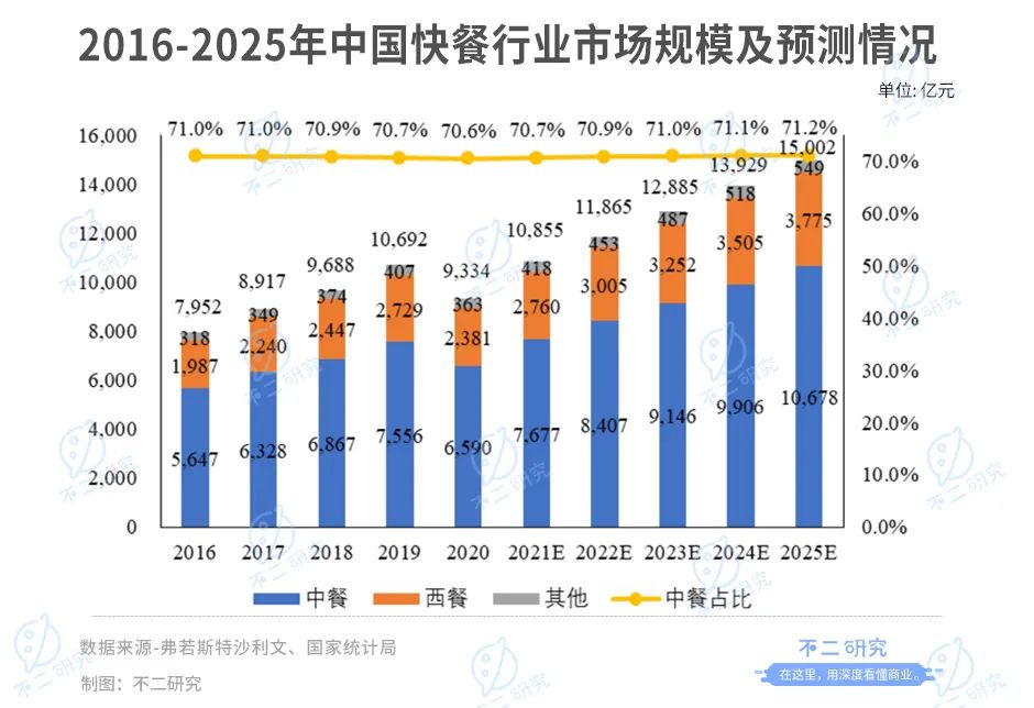 目前,中式快餐行業(yè)正經(jīng)歷快速發(fā)展,老鄉(xiāng)雞還有很大的成長空間。弗若斯特沙利文報(bào)告顯示,2020年~2025年,中式快餐行業(yè)復(fù)合年增長率預(yù)計(jì)為14%,2025年市場規(guī)模將達(dá)到12685 億元;根據(jù)國家統(tǒng)計(jì)局?jǐn)?shù)據(jù),2020年連鎖快餐服務(wù)業(yè)營收為1102億元,老鄉(xiāng)雞占比僅為3.13%。