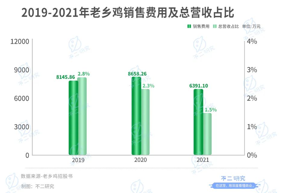招股書顯示,2019-2021年老鄉(xiāng)雞營銷費(fèi)用分別為8145.86萬、8658.26萬和6391.10萬元,占總營收比重分別為2.8%、2.3%和1.5%,遠(yuǎn)高于同期謀求上市的鄉(xiāng)村基以及營收總體規(guī)模相近的九毛九。