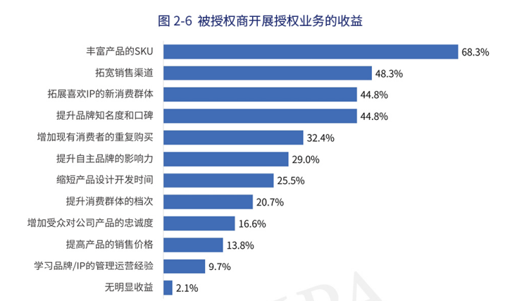 通過獲取授權,被授權商得到的第一大收益是豐富產(chǎn)品的SKU,占比68.3%;其次是拓寬銷售渠道,占比48.3%;再次為拓寬消費群體(44.8%)、提升品牌知名度和美譽度(44.8%)、增加復購(32.4%)。
