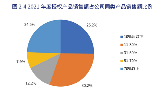有24.5%的受訪被授權商表示,授權產(chǎn)品的銷售額占到公司同類產(chǎn)品總額的70%以上,這類企業(yè)對IP的依存度高。55.4%的受訪被授權商表示,授權產(chǎn)品的銷售額占到公司同類產(chǎn)品總額的30%及以下。
