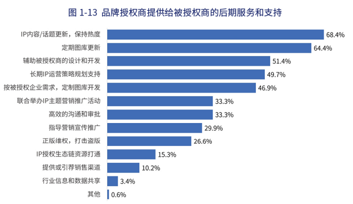 合作開始后,品牌授權商會給被授權商提供多種服務與支持,前三類分別為IP內(nèi)容/話題更新(68.4%)、定期圖庫更新(64.4%)、輔助設計和開發(fā)(54.4%),這些被普遍視為授權商必備的服務。
