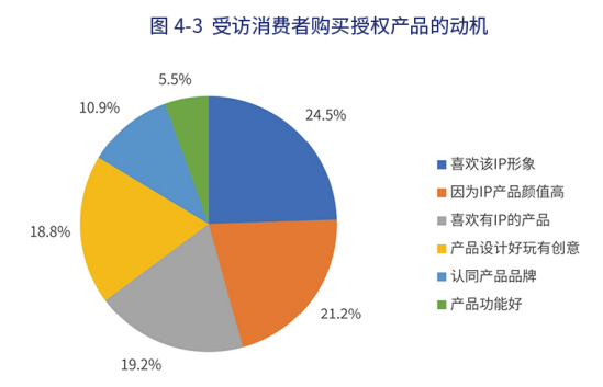 受訪消費者購買授權產(chǎn)品,主要是因為喜歡該IP形象(24.5%)、產(chǎn)品顏值高(21.2%)、喜歡有IP的產(chǎn)品(19.2%)等,購買授權產(chǎn)品的動機可概括為“好看”“好玩”“好喜歡”。
