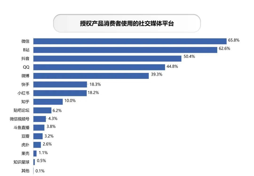 2021年授權產(chǎn)品受訪消費者使用的社交媒體平臺排名前三名為:微信(65.8%)、B站(62.6%)、抖音(50.4%),三者分別作為以即時通訊、興趣社交、短視頻主導的生態(tài)系統(tǒng),在IP授權產(chǎn)品的信息發(fā)布、傳播及消費者互動方面具有差異化優(yōu)勢。
