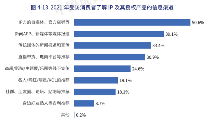 受訪消費者主要通過IP方的自媒體和官方店鋪(50.6%)、新媒體報道(39.1%)、傳統(tǒng)媒體報道宣傳(33.4%)、直播帶貨與電商推薦(30.9%)、商超影院樂園等線下宣傳(24.6%)等渠道了解授權產(chǎn)品信息。
