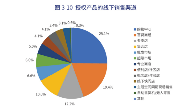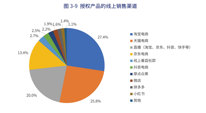 品牌授權產(chǎn)品的線上渠道中,淘寶(27.4%)、天貓(25.8%)、直播渠道(20%)、京東(13.4%)和線上垂直社群位列前五。