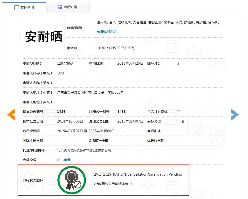根據(jù)中國商標局信息顯示,自然人李洵于2013年7月首次對安耐曬第3類商標進行了申請,并于2015年1月獲得了注冊。目前該商標的狀態(tài)顯示為“撤銷/無效宣告申請審查中”。這意味著,有第三方對該商標提出了撤銷/無效宣告的申請,但根據(jù)《商標法》相關規(guī)定,該商標目前仍然有效。
