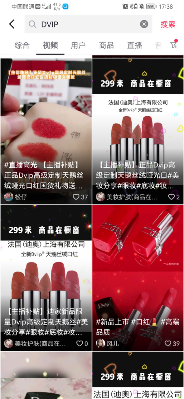 青眼以上述關鍵詞在抖音上搜索時,不少種草視頻和店鋪中宣稱,“法國(迪奧)上海有限公司全新Dvip天鵝絲絨口紅”“HLZM則宣稱為海藍之謎(英國)有限公司”,且價格不菲,如Dvip天鵝絲絨口紅售價299元。并且,從外觀上看,“DVIP”的口紅與LVMH集團旗下迪奧口紅非常相似,“HLZM”旗下產品則撞臉雅詩蘭黛集團旗下的貴婦品牌“海藍之謎”。