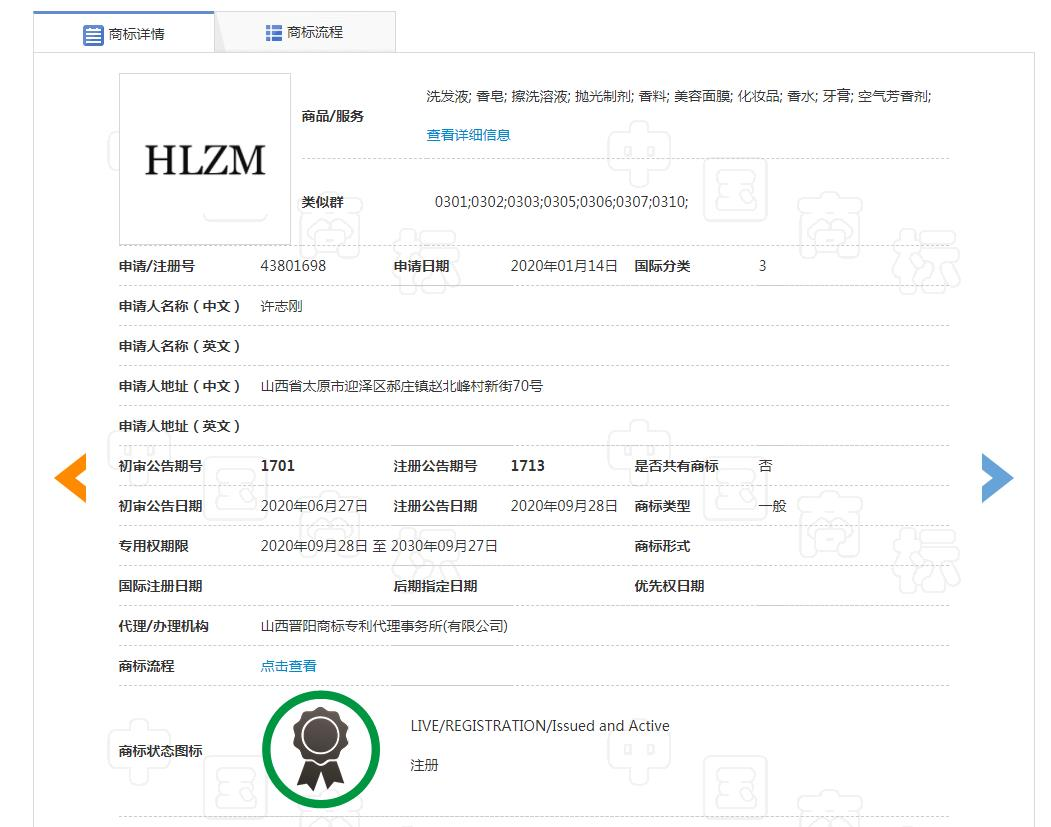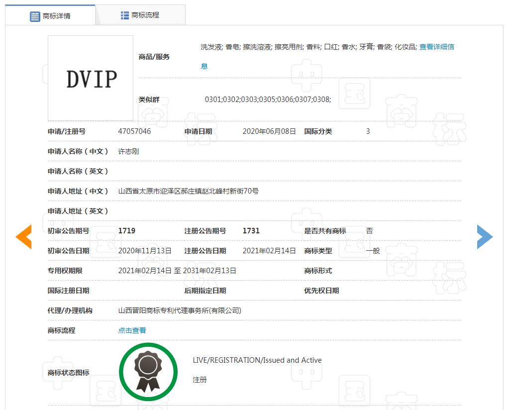 更為巧合的是,中國商標網(wǎng)信息還顯示,“DVIP”和“HLZM”第3類商標所屬權均為自然人“許志剛”所有?!癉VIP”于2020年6月申請注冊,2021年2月通過注冊;“HLZM”則是于2020年1月申請,同年9月注冊成功。