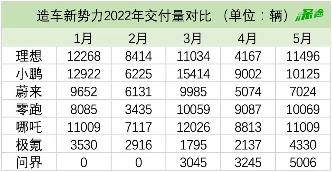 與4月份的慘淡不同,在剛剛過去的5月,各家都交出了相對亮眼的好成績。最能打的是理想,交付11496輛,成為5月造車新勢力冠軍。哪吒緊隨其后,11009輛的交付量,與理想相差不多。