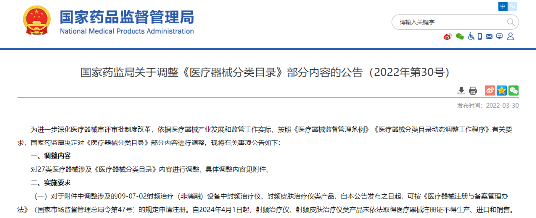 今年3月,國家藥監(jiān)局關(guān)于調(diào)整《醫(yī)療器械分類目錄》部分內(nèi)容的公告發(fā)布,率先明確射頻治療儀、射頻皮膚治療儀類產(chǎn)品按第三類醫(yī)療器械管理,并按《醫(yī)療器械注冊(cè)與備案管理辦法》(國家市場監(jiān)督管理總局令第47)的規(guī)定申請(qǐng)注冊(cè)。自2024年4月1日起,射頻治療儀、射頻皮膚治療儀類產(chǎn)品未依法取得醫(yī)療器械注冊(cè)證不得生產(chǎn)、進(jìn)口和銷售。