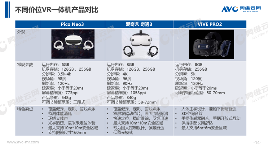 不同價(jià)格的產(chǎn)品在功能賣點(diǎn)上存在差異,我們選取不同價(jià)位的三款VR產(chǎn)品(Pico Neo3(一體)、愛奇藝奇遇3(一體)、VIVE PRO2(分體))進(jìn)行對(duì)比,差異主要有以下幾個(gè)方面:在常規(guī)參數(shù)方面,中高端價(jià)位產(chǎn)品運(yùn)行內(nèi)存多為8GB,相比起低端價(jià)位產(chǎn)品的6GB,在使用時(shí)更加流暢;低端價(jià)位的產(chǎn)品分辨率處在基礎(chǔ)水平,中端價(jià)位有所提升,高端價(jià)位分辨率更高,畫質(zhì)更加清晰;中低端價(jià)位產(chǎn)品的視場角差異不大,而高端價(jià)位視場角更大,沉浸式體驗(yàn)感更強(qiáng);中高端價(jià)位產(chǎn)品的瞳距采用無極式調(diào)節(jié)方式,適用人群更加廣泛。在產(chǎn)品設(shè)計(jì)方面,隨著價(jià)位的提升,產(chǎn)品更加注重佩戴的平衡感和舒適感。