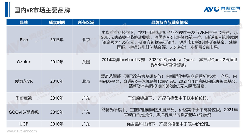 頭部品牌分別是Pico、Oculus、愛奇藝VR。2021年8月,字節(jié)跳動(dòng)斥巨資收購VR創(chuàng)業(yè)公司Pico,加碼VR業(yè)務(wù);Facebook旗下的Oculus VR設(shè)備產(chǎn)品在中國市場也有不俗的表現(xiàn),作為世界級(jí)的成熟品牌,Oculus的VR設(shè)備不論從硬件體驗(yàn)還是軟件生態(tài)上都具備強(qiáng)勢(shì)的競爭力;愛奇藝作為百度生態(tài)戰(zhàn)略內(nèi)容的重要組成部分,依托其原有的廣闊視頻平臺(tái)入局VR市場。